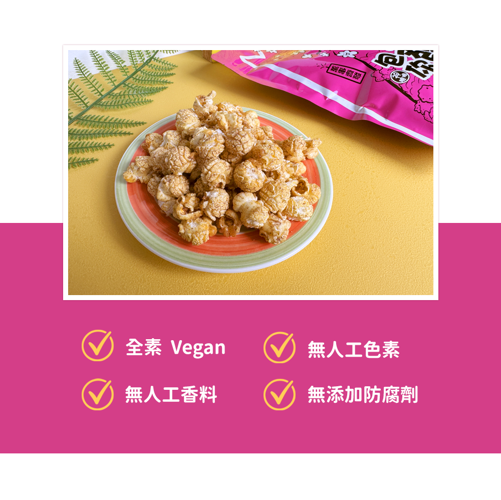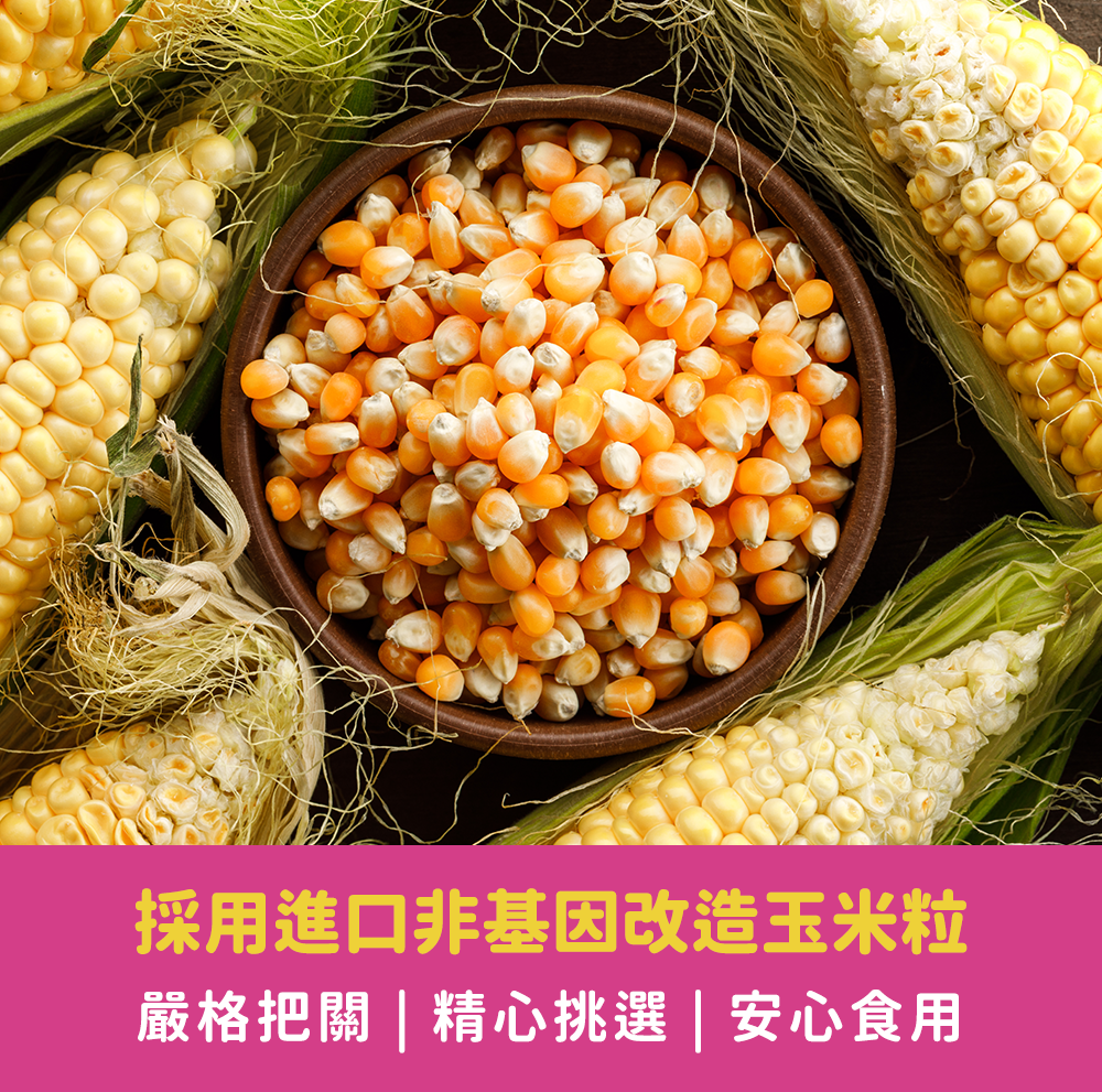 成分:進口玉米粒(非基改)、棕櫚油、葡萄糖、砂糖、海藻糖、紅黎麥粉、玫瑰岩鹽、白胡椒