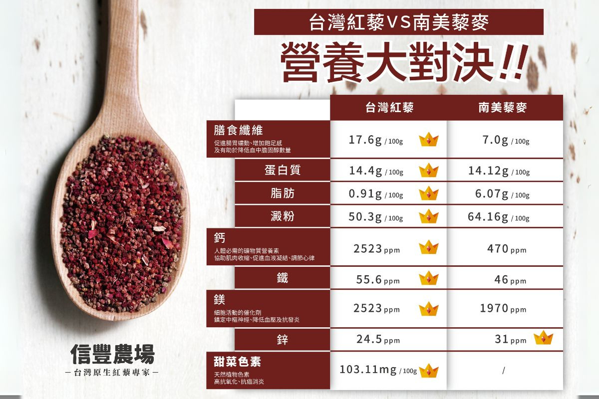 經屏東科技大學研究發現,台灣紅藜是正港台灣本土的原生物種,是藜麥的近親。外觀上比藜麥細小,更厲害的是,其營養成分均高於藜麥,熱量又比藜麥低!