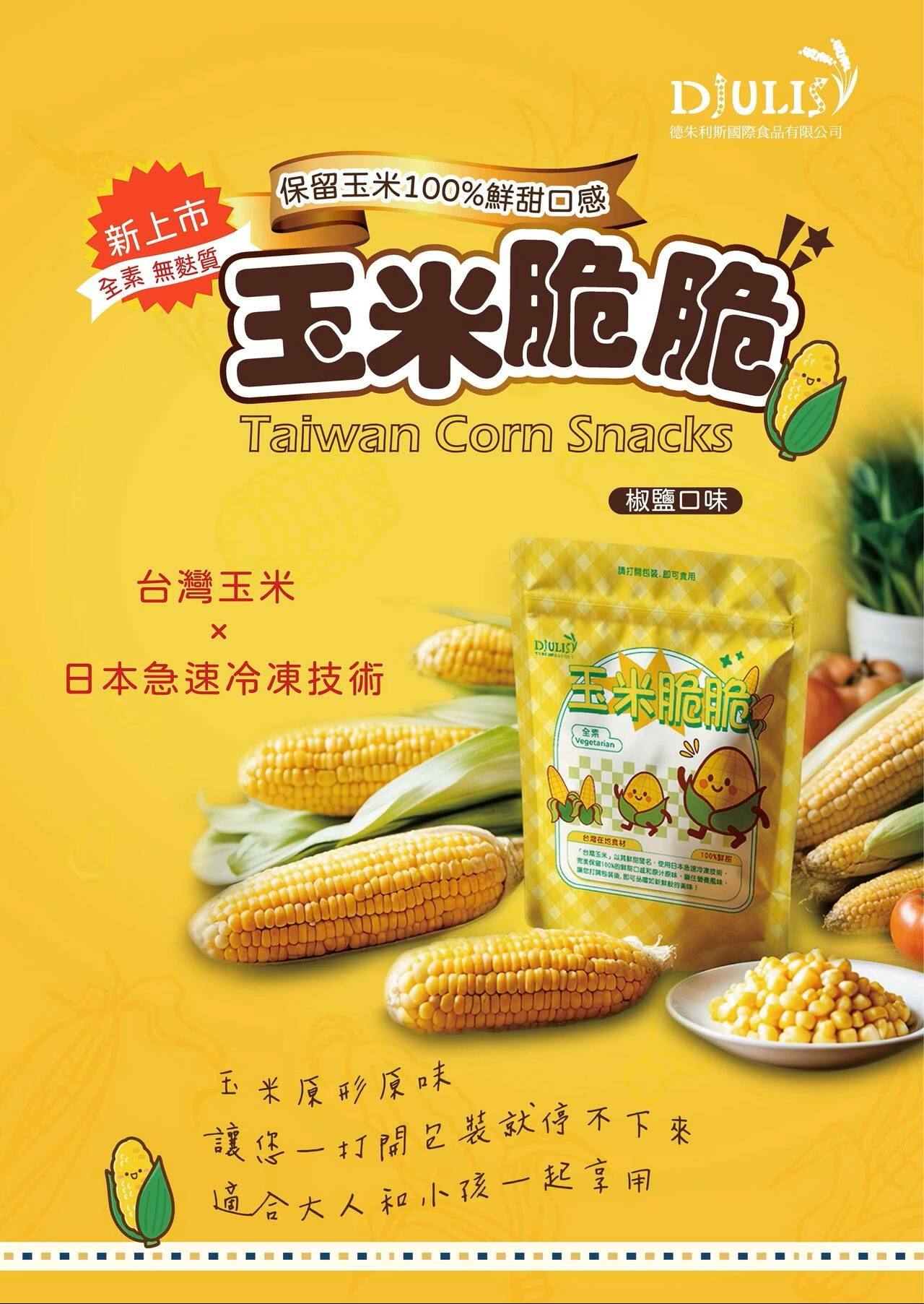 DJULIS 德朱利斯【玉米脆脆】嚴選台灣在地甜玉米,保留原粒完整形狀,不是爆米花、也不是玉米片,而是真材實料的玉米本人!採用日本急速冷凍與低溫酥炸技術,完美保留鮮甜風味與酥脆口感,不含甜味劑、無麩質、純素可食。榮獲 2025新味食潮特別獎-減碳實現、銀髮友善食品獎 與農村好物認證,是結合在地農產與永續理念的台東名產、台灣伴手禮與送禮零嘴新選擇!