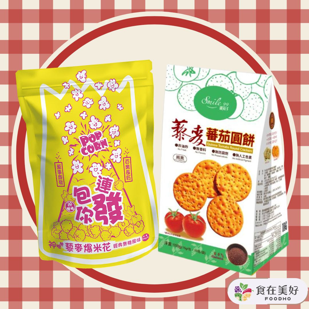 藜麥系列 (爆米花/蕃茄圓餅): 超級食物_藜麥入料,好吃又營養。焦糖爆米花清甜不膩、藜麥蕃茄圓餅清爽鹹蘇打餅,涮嘴好吃