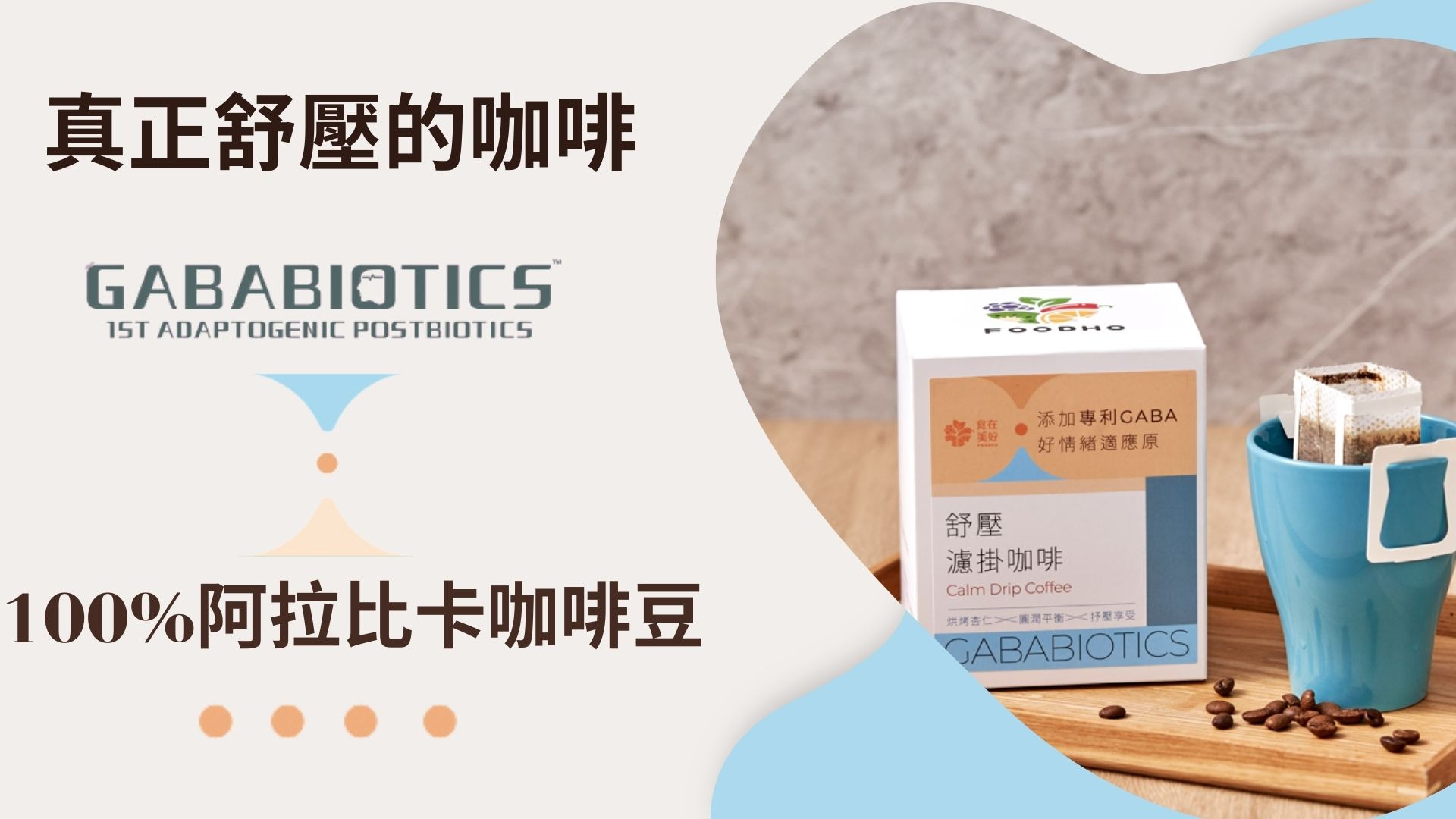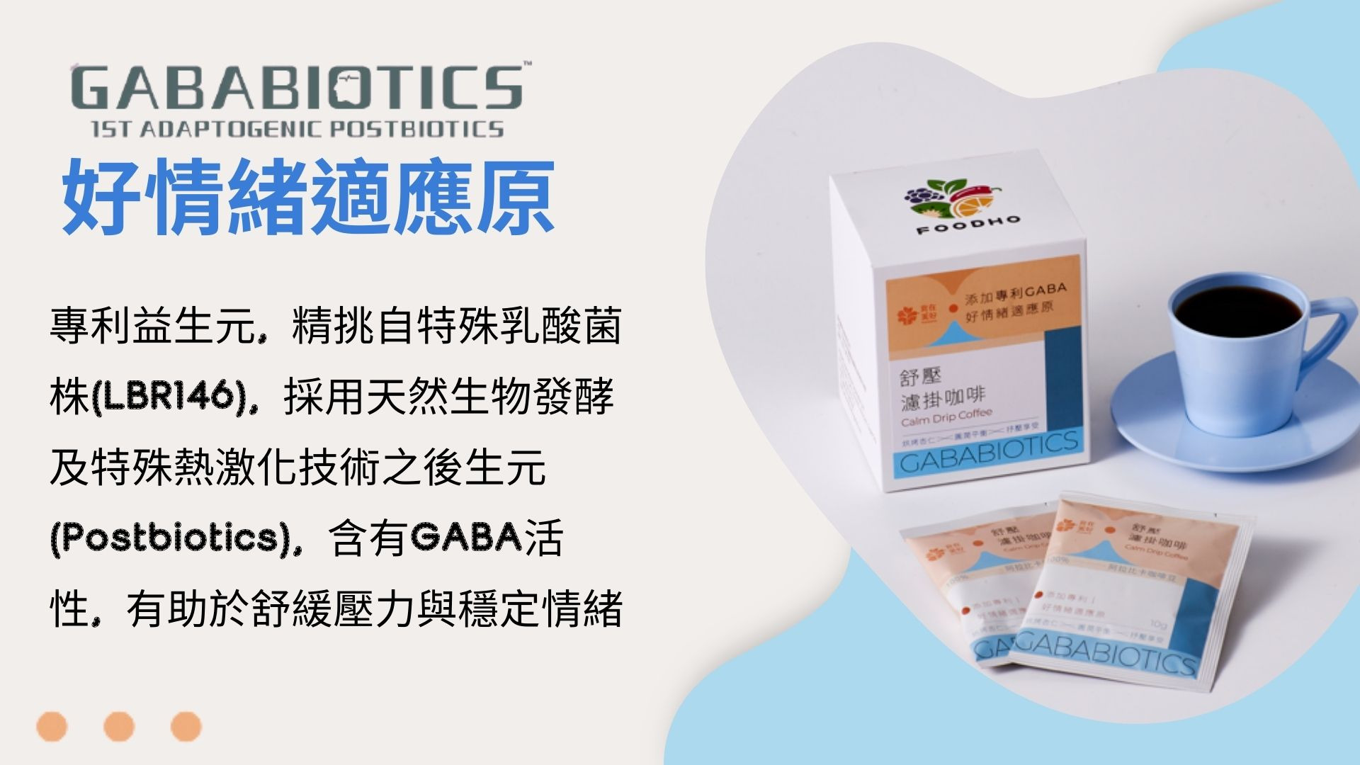 GABA濾掛咖啡添加專利研發的「GABABIOTICS好情緒適應原」,其精挑自特殊乳酸菌株(LBR146),採用天然生物發酵及特殊熱激化技術之後生元,含有GABA活性,有助於舒緩壓力與穩定情緒。