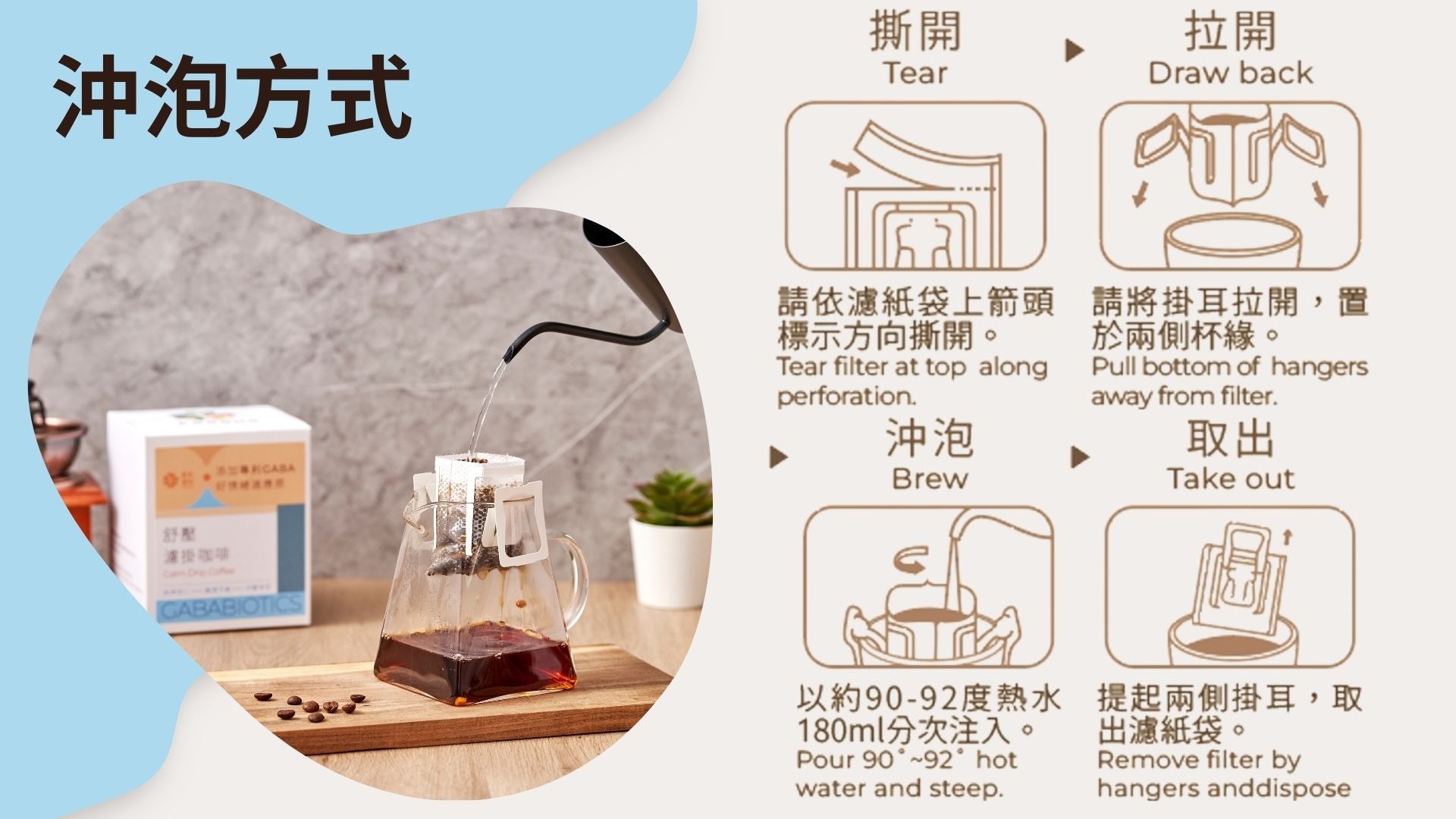 每包添加100mg GABABIOTICS之濾掛咖啡,從沖泡時,就開始進入放鬆心情的儀式,咖啡香氣、醇厚咖啡口感,尾韻回甘,讓每一口都是抒壓的享受。