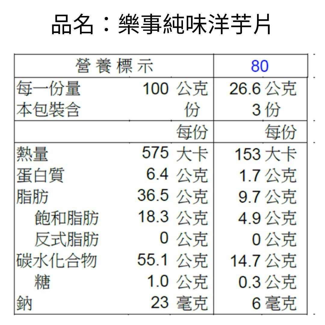 樂事嚴選新鮮馬鈴薯,鮮切成金黃香脆洋芋片,不添加一顆鹽,越咬越驚豔讓你忍不住一口接一口!品名:樂事純味洋芋片( 無添加鹽) 80g/包_輕脆薄切原料:馬鈴薯、棕櫚油。