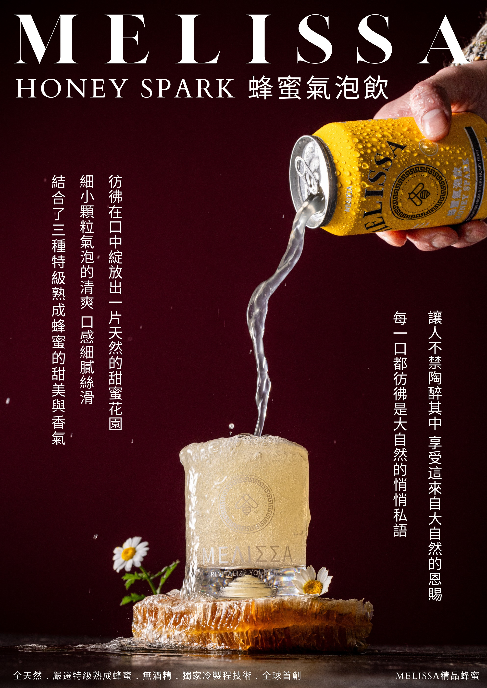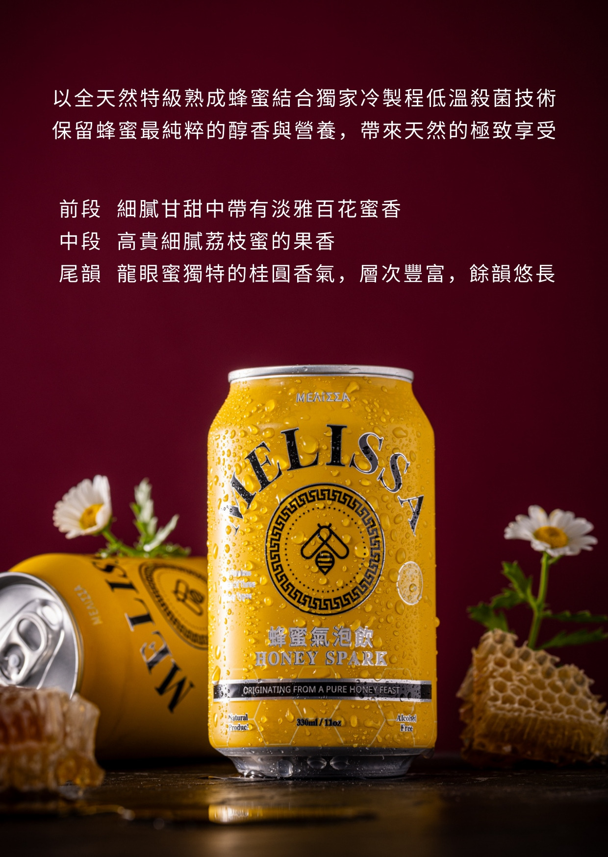 MELISSA蜂蜜氣泡飲,就像是夏日午後的一絲微風,清新而迷人 結合了三種蜂蜜的甜美與香氣,氣泡飲料的清爽,口感細膩滑, 仿佛在口中綻放出一片天然的甜蜜的花園,每一口都彷彿是大自然的悄悄私語,讓人不禁陶醉其中。其淡雅的蜜香在舌頭上翩翩起舞,帶來一種身臨其境感受,讓人彷彿置身於一片田園的懷抱中,享受著大自然的恩賜。