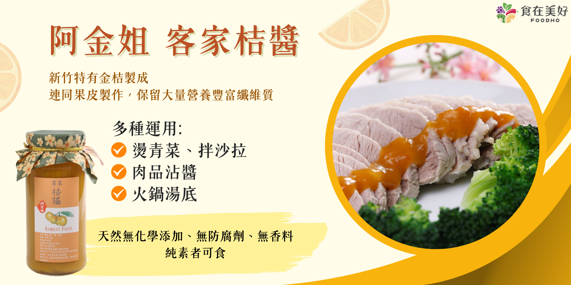 新竹特有金桔,在每年11~1月盛產,以保證價格跟農民收購,並與慢飛天使合作,連同果皮一起製作,保留大量營養豐富的纖維質,獨特的微酸微鹹風味成了客家飲食文化中中不可或缺的沾醬。